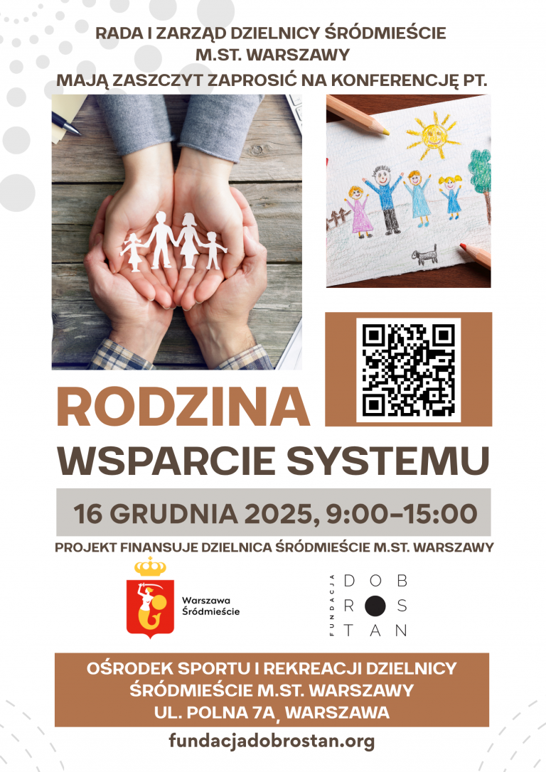 RADA I ZARZĄD DZIELNICY ŚRÓDMIEŚCIE m.st. WARSZAWY mają zaszczyt zaprosić na konferencję „Rodzina – wsparcie systemu” Termin: 16 grudnia 2025 r., godz. 9.00–15.00Miejsce: Ośrodek Sportu i Rekreacji Dzielnicy Śródmieście m.st. Warszawyul. Polna 7A, 00-625 Warszawa Organizator: Fundacja DOBROSTAN z siedzibą w Warszawie Cel wydarzenia Konferencja ma na celu wzmocnienie wiedzy, kompetencji i współpracy osób zaangażowanych…